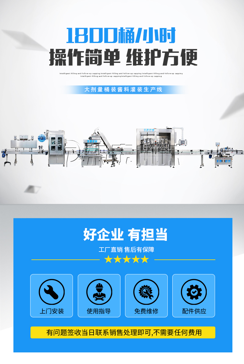 該醬油醋灌裝機采用活塞式伺服系統(tǒng)驅動原理,適用于粘流體中帶小顆粒并且可流動的較為粘稠的物料灌裝。比如:洗衣液、洗潔精、甜面醬、沙拉醬、芝麻醬、食用油等的灌裝。設備采用伺服系統(tǒng)定量推料,在人機界面數(shù)字化調節(jié)計量,并且可設定所需計量,觸摸屏一觸即達,而且可以單頭微調計量。操作簡單,維護方便,節(jié)省人工成本,生產(chǎn)效率更高。