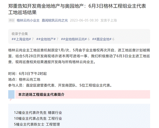 6月14日,奧園金地格林云尚業(yè)主再次發(fā)文,除要求成立嘉定區(qū)級(jí)高層專班,由嘉定區(qū)區(qū)委、區(qū)政府主要領(lǐng)導(dǎo)進(jìn)入高層專班,統(tǒng)籌協(xié)調(diào)當(dāng)前區(qū)專班,還提出約談金地商置、奧園集團(tuán)董事級(jí)別高層、徹查資金監(jiān)管賬戶違規(guī)交易、樓盤(pán)質(zhì)量整改等請(qǐng)求,表達(dá)希望開(kāi)發(fā)商保質(zhì)保量、按時(shí)交付、產(chǎn)證保障的強(qiáng)烈訴求。