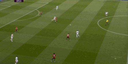 第二次的起點便是齊爾克澤被鏟斷,然后曼聯(lián)的三線距離依然早已超過了四格草皮,姆貝烏莫和齊爾克澤的包夾未到,便又被對手提前出腳,轉移了出去: