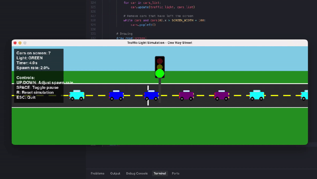 另一位網友則對比測試了編程能力。輸入同樣的提示詞:write a python code that visualizes how a traffic light works in a one way street with cars entering at random rate.(編寫一個 Python 代碼,可視化單行道中交通信號燈的工作原理,車輛以隨機速率駛入。)
