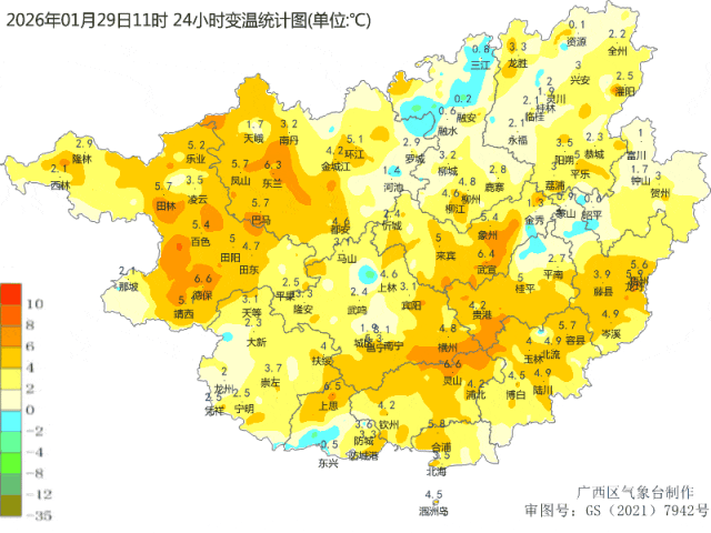 30日上午至2月1日,受較強冷空氣影響,桂東日平均氣溫下降4~6℃、局地8℃以上,桂西下降2~4℃、局地6℃以上。